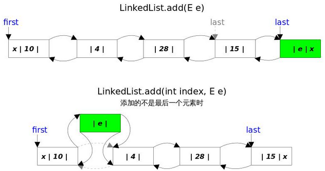 add()方法有两个版本,一个是add(E e),该方法在LinkedList的末尾插入元素,因为有last指向链表末尾,在末尾插入元素的花费是常数时间。只需要简单修改几个相关引用即可;另一个是add(int index, E element),该方法是在指定下表处插入元素,需要先通过线性查找找到具体位置,然后修改相关引用完成插入操作。