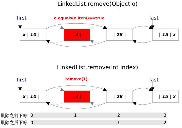remove()方法也有两个版本,一个是删除跟指定元素相等的第一个元素remove(Object o),另一个是删除指定下标处的元素remove(int index)。