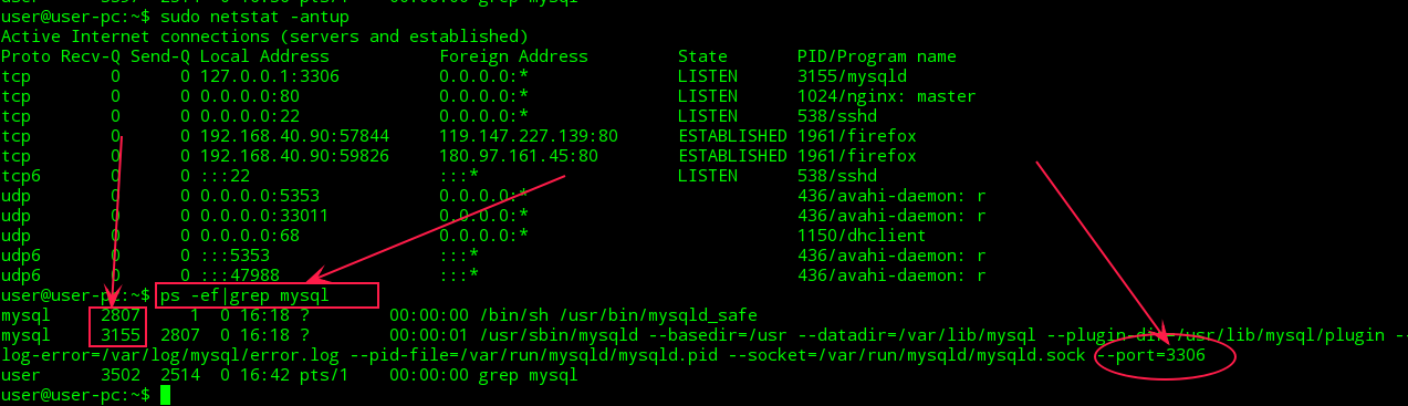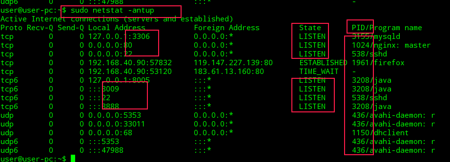 使用命令:sudo netstat -antup|grep PID号 来查询该目标端口的开放情况!当然前提是你要知道该PID的号码: