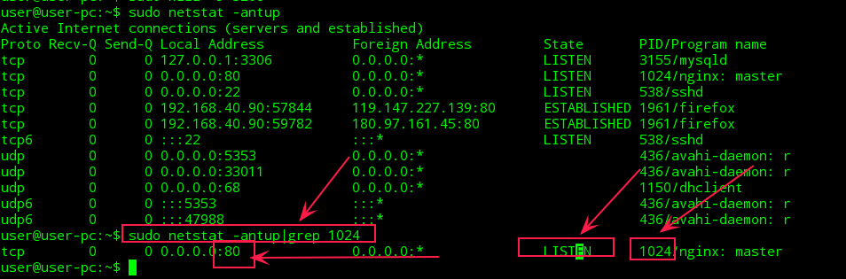 下图是使用PID为1024来查看端口的情况,我们可以看到该端口是处于LISTEN监听的状态,且端口为80.