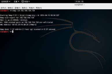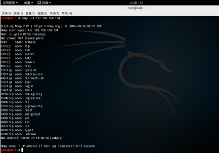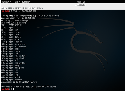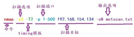 nmap 命令后跟的是扫描类型,第一个参数sS代表隐蔽扫描,第二个参数T2是timing选项,设置了nmap扫描时的速度、流量;第三个参数-p设置了需要扫描的端口,后面的192.168.154.134是扫描目标,可以是ip地址,也可以设置为网段地址;扫描目标后跟着输出选项,可以将扫描结果保存成文件,供测试人员分析。