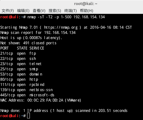 T4:Aggressive 快速网络扫描,并行扫描,两次扫描间隔0秒,扫描速度较快。