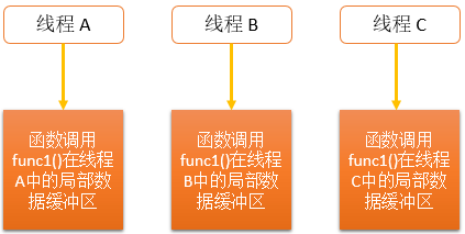 如果需要在一个线程内部的各个函数调用都能访问、但其它线程不能访问的变量,这需要新的机制来实现,我们称之为Static memory local to a thread (线程局部静态变量),同时也可称之为线程特有数据(TSD: Thread-Specific Data)或者线程局部存储(TLS: Thread-Local Storage)。这一类型的数据,在程序中每个线程都会分别维护一份变量的副本(copy),并且长期存在于该线程中,对此类变量的操作不影响其他线程。如下图: