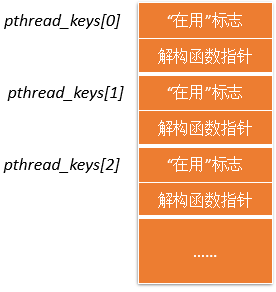 数组的每个元素都是一个包含两个字段的结构,第一个字段标记该数组元素是否在用,第二个字段用于存放针对此键、线程局部存储变的解构函数的一个副本,即destructor函数。