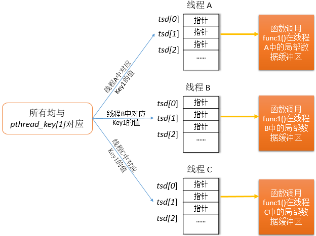 2. 在常见的存储pthread_setspecific()函数参数value的实现中,大多数都类似于下图的实现。图中假设pthread_keys[1]分配给func1()函数,pthread API为每个函数维护指向线程局部存储数据块的一个指针数组,其中每个数组元素都与图线程局部数据键的实现(上图)中的全局pthread_keys中元素一一对应。