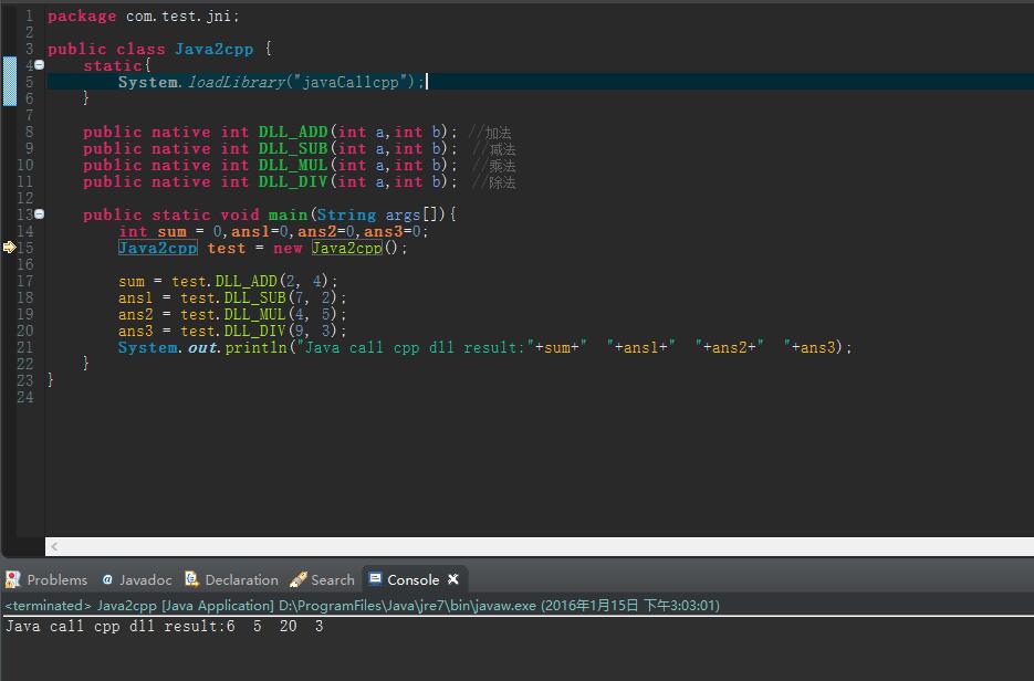 把第五步生成的JavaCallcpp.dll拷进JRE安装路径下的bin文件夹内,运行java程序即可。结果如下: