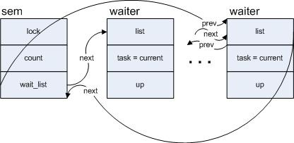 将当前进程赋给task,并利用其list成员将该变量的节点加入到以sem中的wait_list为头部的一个列表中,假设有多个进程在sem上调用down_interruptible,则sem的wait_list上形成的队列如下图: