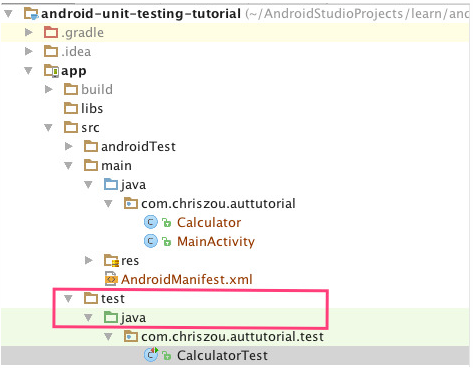 我们知道,在一个android gradle project中,源代码默认是放在src/main/java下面的。而对应的单元测试代码则是放在src/test/java下面的,如下图所示: