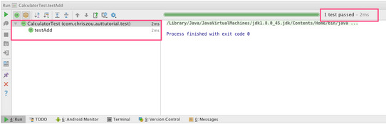 一般来说,我们写单元测试,会用到一些单元测试框架。常见的Java单元测试框架有 JUnit 、 TestNG 等等。在这个系列的文章中,我采用JUnit 4,这也是用的多的一个测试框架。上面的第三部, Assert.assertEquals(3, sum); 用的是JUnit里面的验证结果的方法,常见的是调用 Assert 类的一些assert方法。除了上面用到的 assertEquals ,还有 assertTrue , assertNotNull 等等。关于JUnit,我会在后面的系列文章中专门介绍。