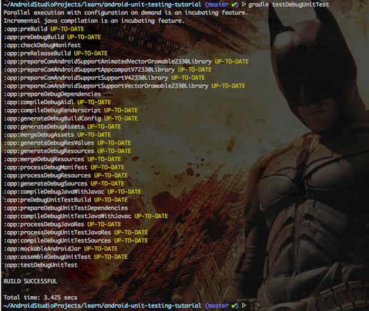 除了在AndroidStudio里面运行,你还可以在命令行通过 gradle testDebugUnitTest ,或者是 gradle testReleaseUnitTest ,分别运行debug和release版本的unit testing,这种方式可以一次性运行所有测试类的所有测试方法。 这种方式的运行结果如下图所示: