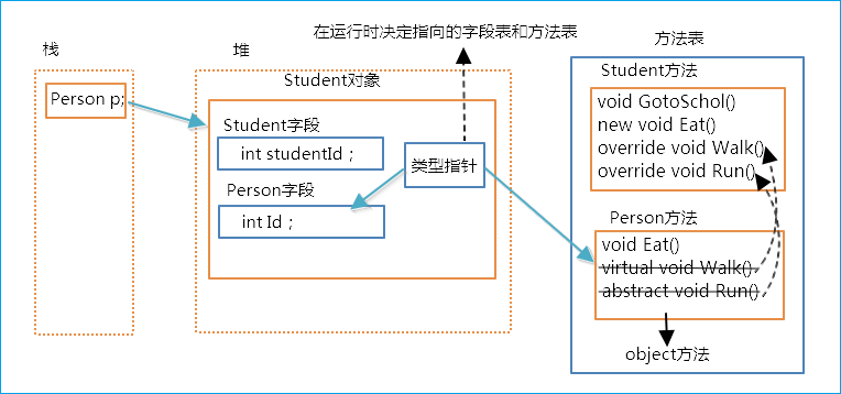 我们在写程序时为了实现多态一般都会使用父类对象指向子类。那么当我写入Person p=new Student();时便在堆中创建了一个子类对象,下面是关于父类对象指向子类的内存分配图。我在Person中添加了虚方法和抽象方法,并在Student子类重写了方法。从图中可以看出一旦子类重写了父类的虚方法或抽象方法,则Person方法表中的2个方法将会被子类覆盖,我们可根据它来实现多态。另外在Student方法表中还有一个new void Eat()方法,不过它是无法被p调用的因为此时的new Eat()属于子类。也是说除了被覆盖的方法外,p只能调用Person方法表中的方法,如果找不到则会继续寻找Person父类的方法直到object。注意是不会往回找的,它不会去Student方法表中寻找方法。