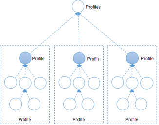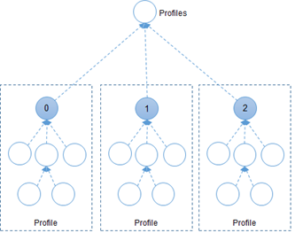 配置绑定从本质上讲是承载相同信息的数据在不同结构之间的转换,说得更加具体一点是数据从基于数据字典的物理结构转换成基于树的逻辑结构。要理解针对集合的配置绑定,需要首先了解一个集合对象在逻辑上体现怎样一棵树。对于一个集合对象来说,组成它的元素自然视为集合的子节点,所以一个包含三个Profile对象的集合可以由左图所示的树来体现。
