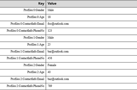 xxx如果需要通过配置的形式来表示一个完整的Profile对象,我们只需要将四个叶子节点(性别、年龄、电子邮箱地址和电话号码)对应的数据定义在配置之中即可。对于承载配置数据的数据字典中,我们需要按照如左边表格所示的方式将这四个叶子节点的路径作为字典元素的Key。