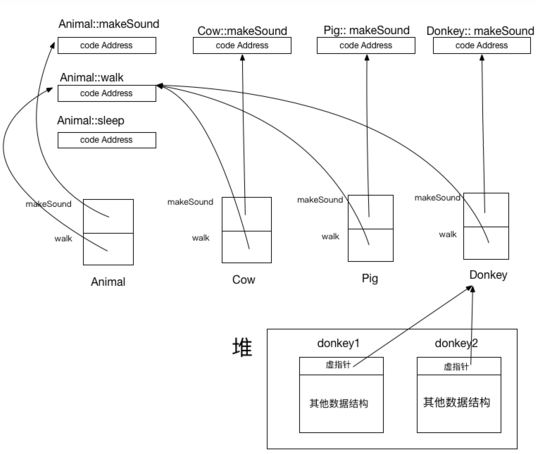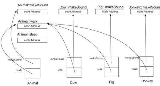 他们的虚表中记录着不同函数的地址值。可以看到Cow、Pig、Donkey重写了makeSound()函数但是没有重写walk()函数。因此在调用makeSound()时,会直接jump到自己实现的code Address。而调用walk()时,则会jump到Animal父类walk的Code Address。