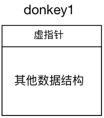 虚指针是类实例对象指向虚表的指针,存在于对象头部,大小为4个字节,比如我们的Donkey类的实例化对象数据结构如下:
