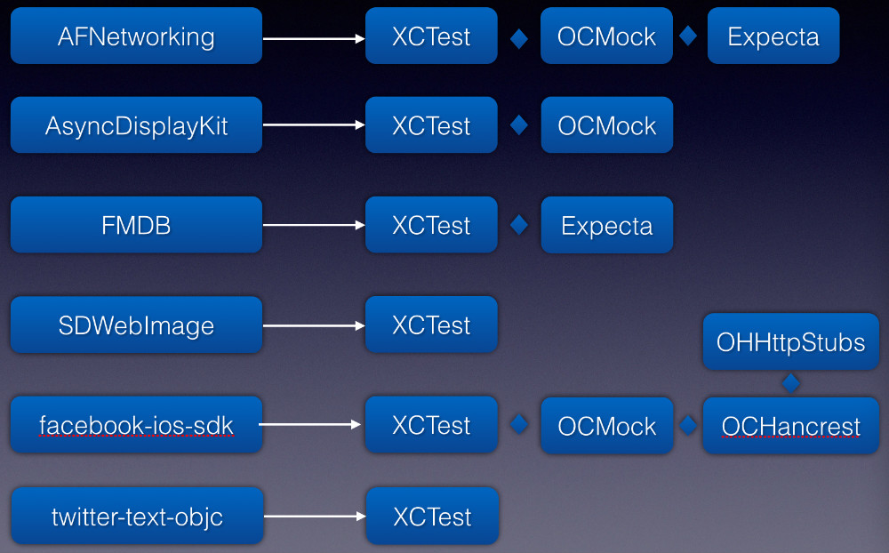 写测试用例总得有个框架吧,现在比较流行的属Apple自带的XCTest和第三方的GHUnit。我们来看看他两之间的区别。 XCTest:与Xcode深度集成。而且可以享受Apple后续对XCTest升级的福利。 GHUnit:集成度不如XCTest,安装麻烦。但是有自己的GUI界面。 貌似都各有所长,那么我们来看看Github上的一些知名的开源库都用的是什么测试框架吧。