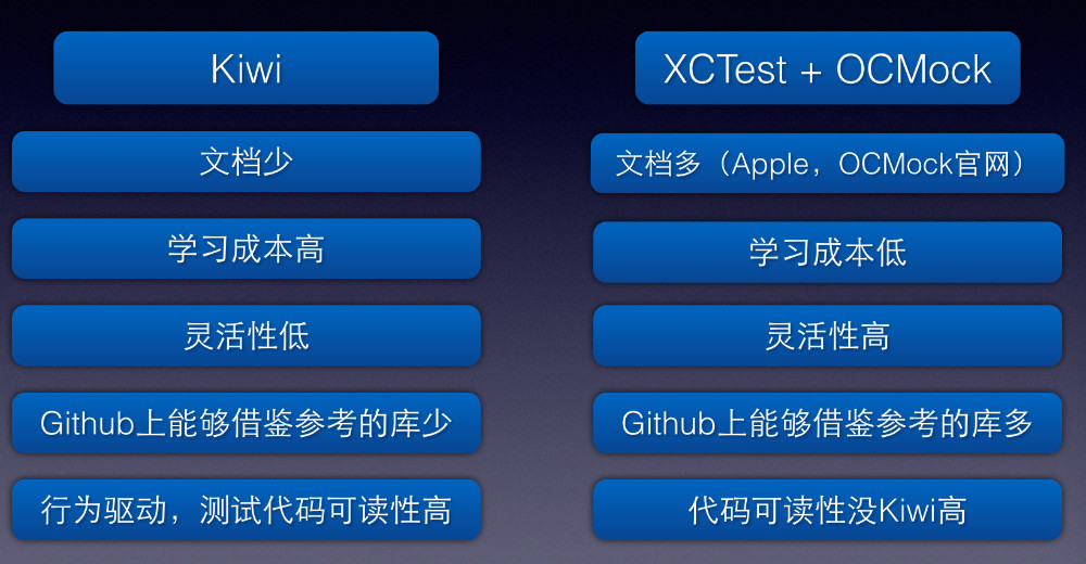 这个测试用例是在说Given a Team,When newly created,it should have a name, and should have 11 players。 的确很清晰,基本不需要注释能知道在干嘛了。 既然BDD这么好,那么我们比较下BDD框架Kiwi和XCTest + OCMock组合的优劣吧。为什么是XCTest + OCMock而不是XCTest,因为Kiwi自带mock功能,而XCTest没有mock功能。