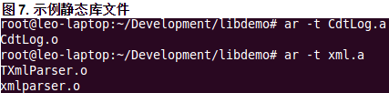 从 图 7中可以得知,CdtLog.a 只包含 CdtLog.o 一个对象文件 , 而 xml.a 包含 TXmlParser.o 和 xmlparser.o 两个对象文件