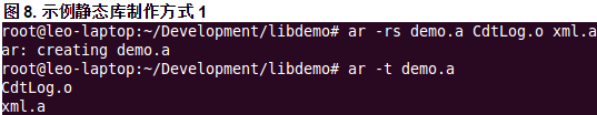 现将 CdtLog.o 提取出来,然后通过 图 8方式创建一个新的静态库 demo.a,可以看出,demo.a 包含的是 CdtLog.o 以及 xml.a,