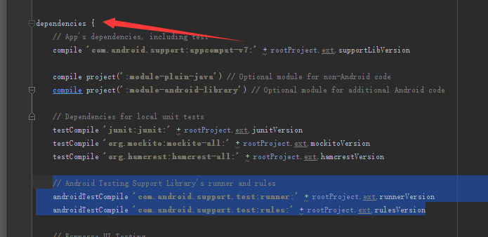 testCompile 'junit:junit:' + rootProject.ext.junitVersion
