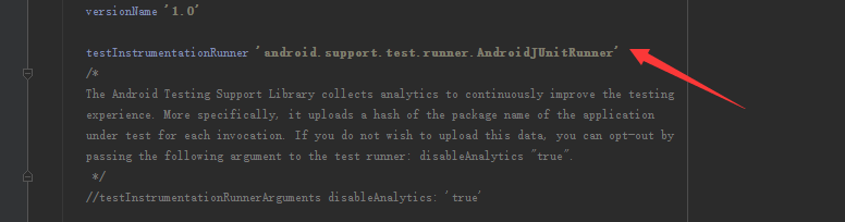 testInstrumentationRunner 'android.support.test.runner.AndroidJUnitRunner'
