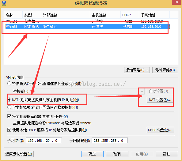 我们要保证我们linux系统采用的nat模式,依次检查下图所示的红框中的内容。一定要保持一致。