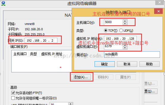 上边的配置检查完毕后,我们需要进行NAT设置,在这里配置一个端口转发。添加一个主机使用的端口,在添加虚拟机中redis服务的ip地址,和端口号。