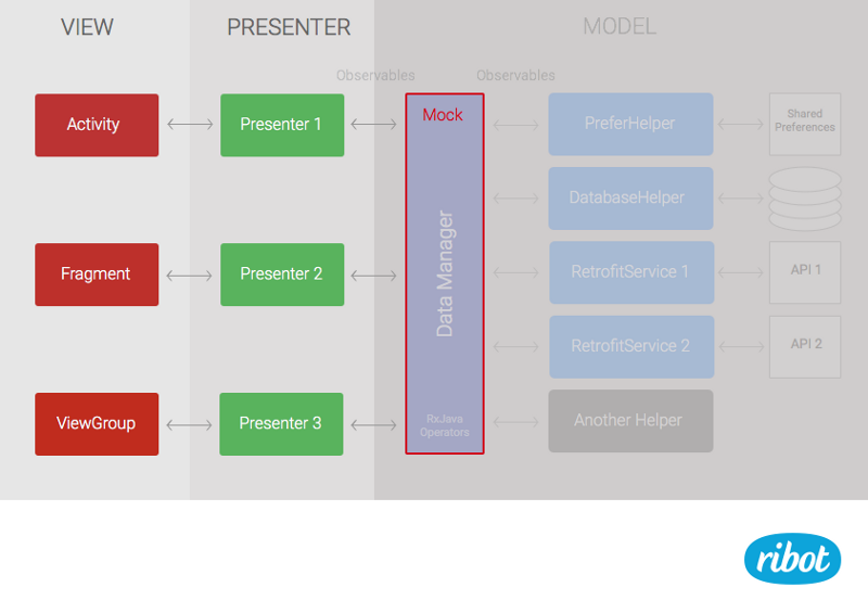 构建一个易于测试的架构有许多种方式。在这里我将使用 ribot 中使用的架构 (译者注:也是在开篇提到的Android应用架构)作为范例,你也可以应用这样的架构方式到任何架构中。我们的架构是基于MVP模式,我们决定在UI测试中去模拟(mock)整个Model层,因此我们可以对数据由更多的操作性,也能够写出更有价值和可靠的测试。