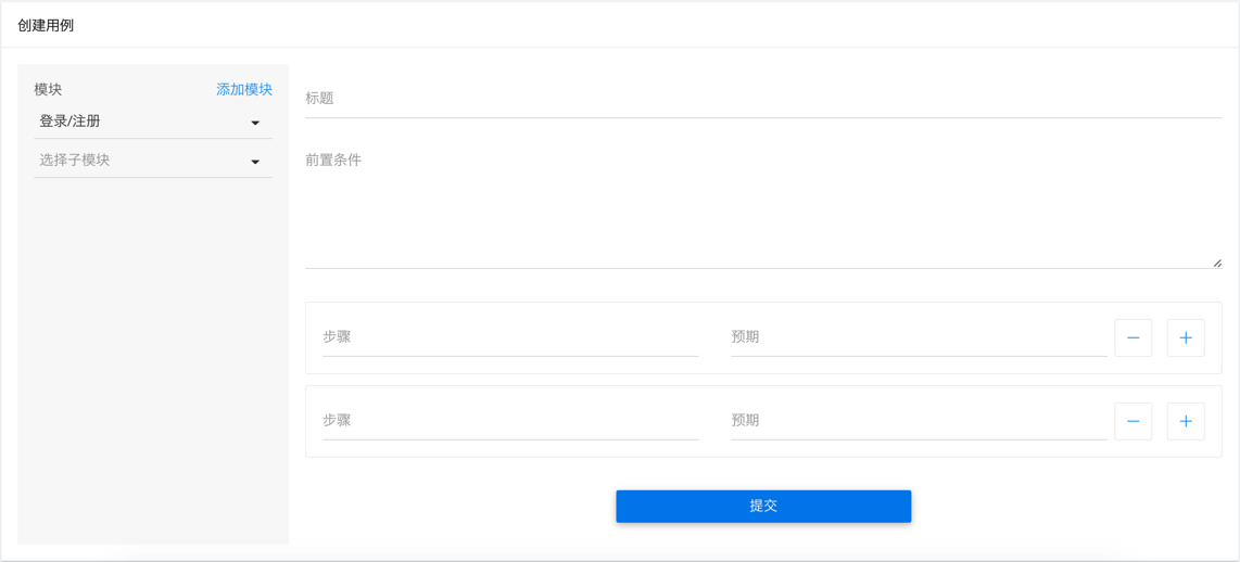 创建用例时,需要选择对应的模块,填写标题、步骤与预期,步骤与预期没有条数限制,并可根据实际情况,进行上下拖拽调整顺序。