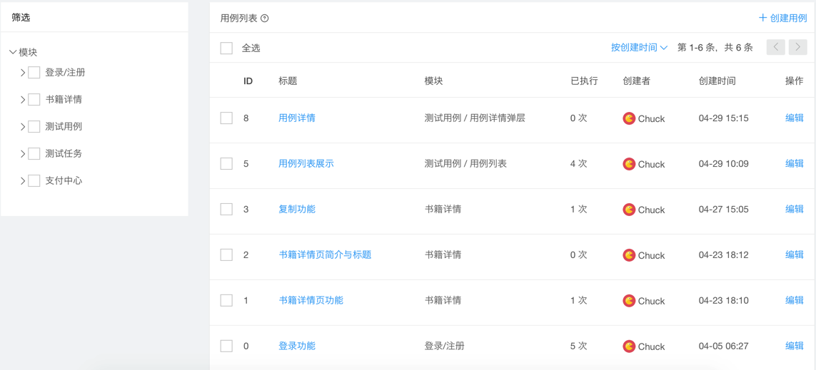 用例列表中,可按模块进行筛选,点击标题可以查看这个用例的历史执行情况,管理员和创建者本人可以对用例进行编辑,但批量删除和批量复制功能管理员可以操作。