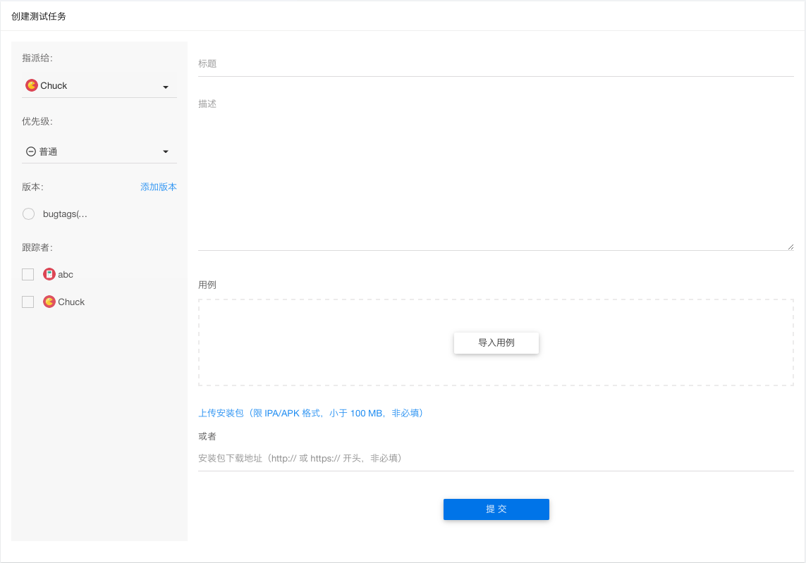 创建测试任务时,需要填写标题、描述、指派者、优先级、版本,并导入本次测试任务中需要执行的用例,也可以上传安装包或填写下载地址。