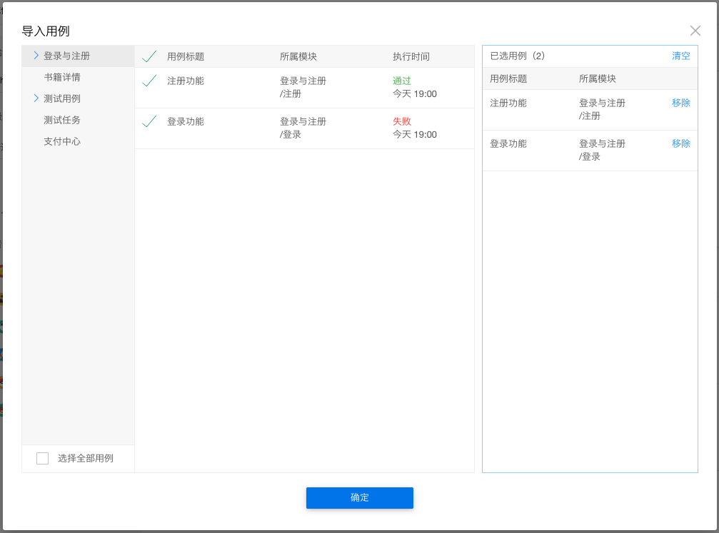 导入用例时,可根据模块进行筛选,勾选后,即可加入到已选用例列表中(支持拖拽)。
