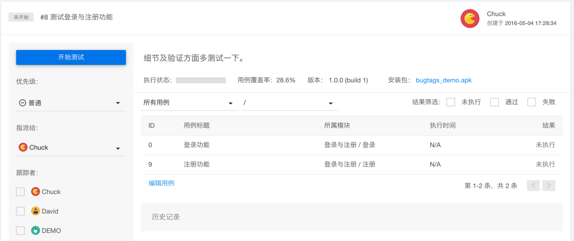 测试任务:是为测试一组用例发起的一次任务,可以指定任务的测试人、优先级、跟踪者、安装包等信息,相关人可及时掌握任务的执行状态。