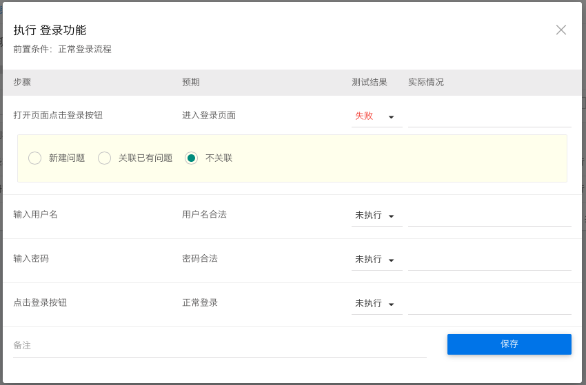 可根据测试情况修改每个步骤的状态( 通过 / 失败 / 未执行 ),当选择测试结果为失败时,可以新建问题并指派给相应开发者,也可以关联现有问题。