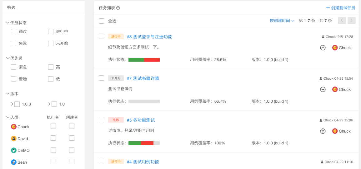 在测试任务列表中,左侧可根据任务状态、优先级、版本、人员进行筛选,右侧可创建时间和优先级进行排序,管理员支持「批量删除」功能。