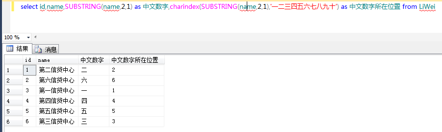 select id,name,SUBSTRING(name,2,1) as 中文数字,charindex(SUBSTRING(name,2,1),'一二三四五六七八九十') as 中文数字所在位置 from LiWei