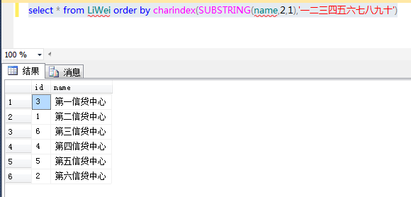 select * from LiWei order by charindex(SUBSTRING(name,2,1),'一二三四五六七八九十')