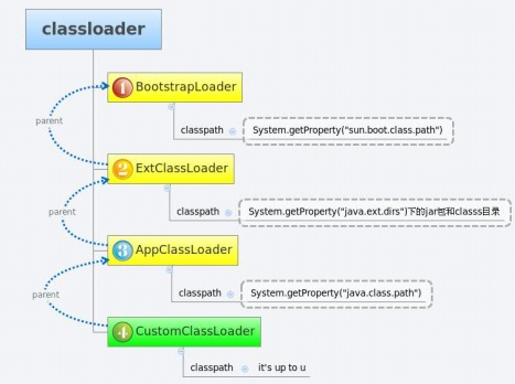 · 类加载器的树状结构:在JVM中,所有类加载器实例按树状结构组织,根结点为引导类加载器。除根结点外的所有类加载器都有一个非空的父类加载器,从而构成树状结构;