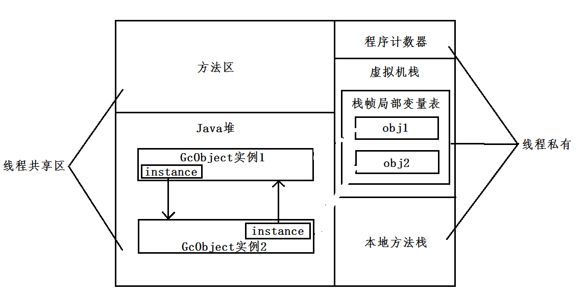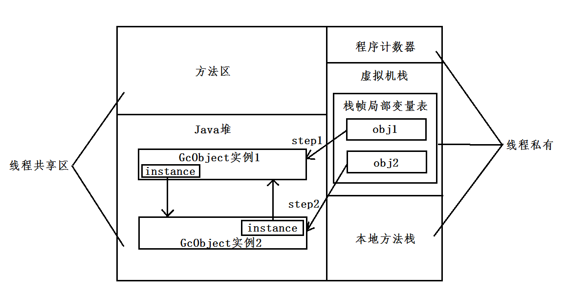 6:栈帧中obj2不再指向Java堆,GcObject实例2的引用计数减1,结果为1。到此,发现GcObject实例1和实例2的计数引用都不为0,那么如果采用的引用计数算法的话,那么这两个实例所占的内存将得不到释放,这便产生了内存泄露。