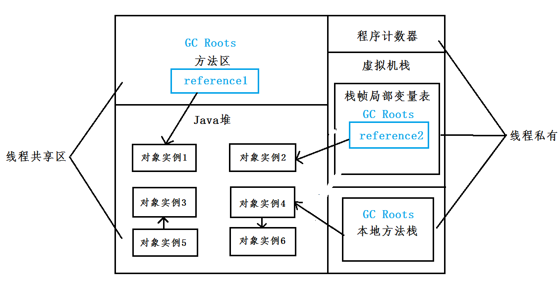 reference1->对象实例1;reference2->对象实例2;reference3-> 对象实例4;reference3->; 对象实例4 ->对象实例6;