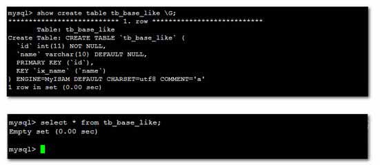 like方法能一模一样的将一个表的结果复制生成一个新表,包括复制表的备注、索引、主键外键、存储引擎等。