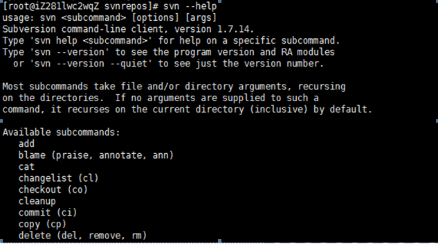 svn --help , 看到下图表示成功。