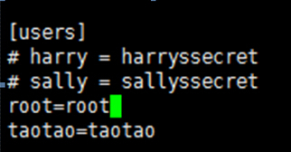 在[users]块中添加用户和密码,格式:帐号=密码