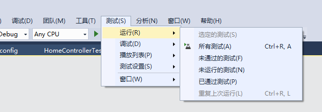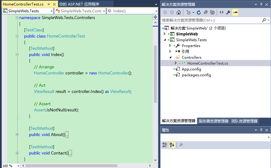 被测试的代码是VS2015下,不带帐号系统的MVC项目。以下为VS自动创建的单元测试项目。
