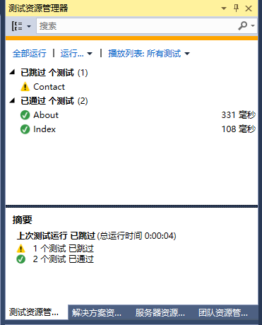 很明显看到被Ignore特性标注的被跳过了测试。还可以选择测试资源管理器中的测试然后进行单个测试,而不是像之前那样测试所有。