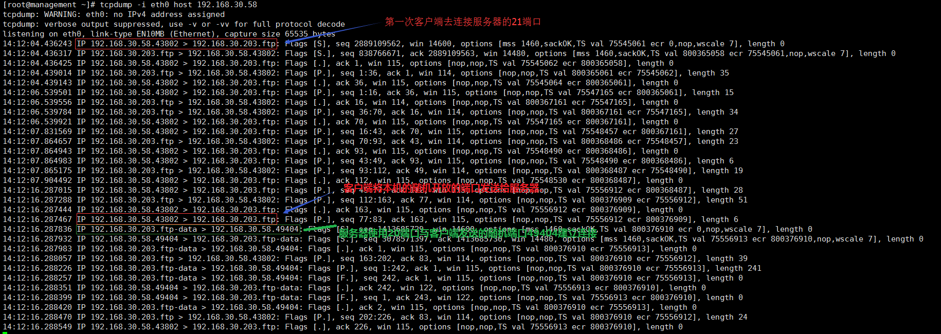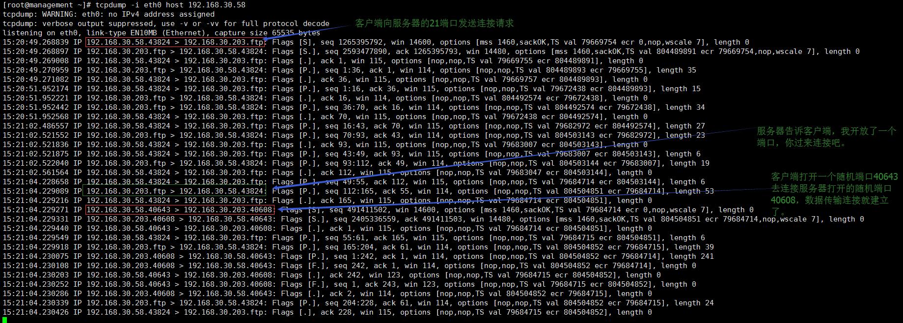 !!!纠正一个错误:上图中的标注客户端将本机的随机开放的端口发送给服务器内容的那一条,实际上不是在这里发送的,而是在 第一次 ftp-data(20)端口 与 端口49404连接的往上数第四条,是在那儿发送的随机端口。