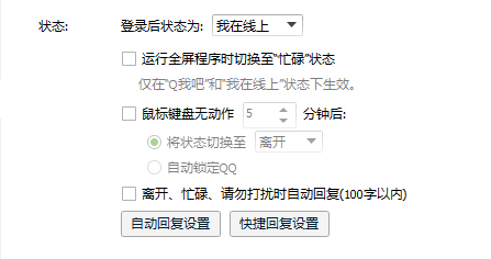 以QQ的状态设置来做一次实践。QQ用户可以对如下的状态方面的设置。后两张图是登录后的状态的可选项和鼠标键盘无动作后将状态切换至的可选项。默认的自动回复有三种,默认的快捷回复有四种。对于自动回复和快捷回复,用户都可以做增、删、改。