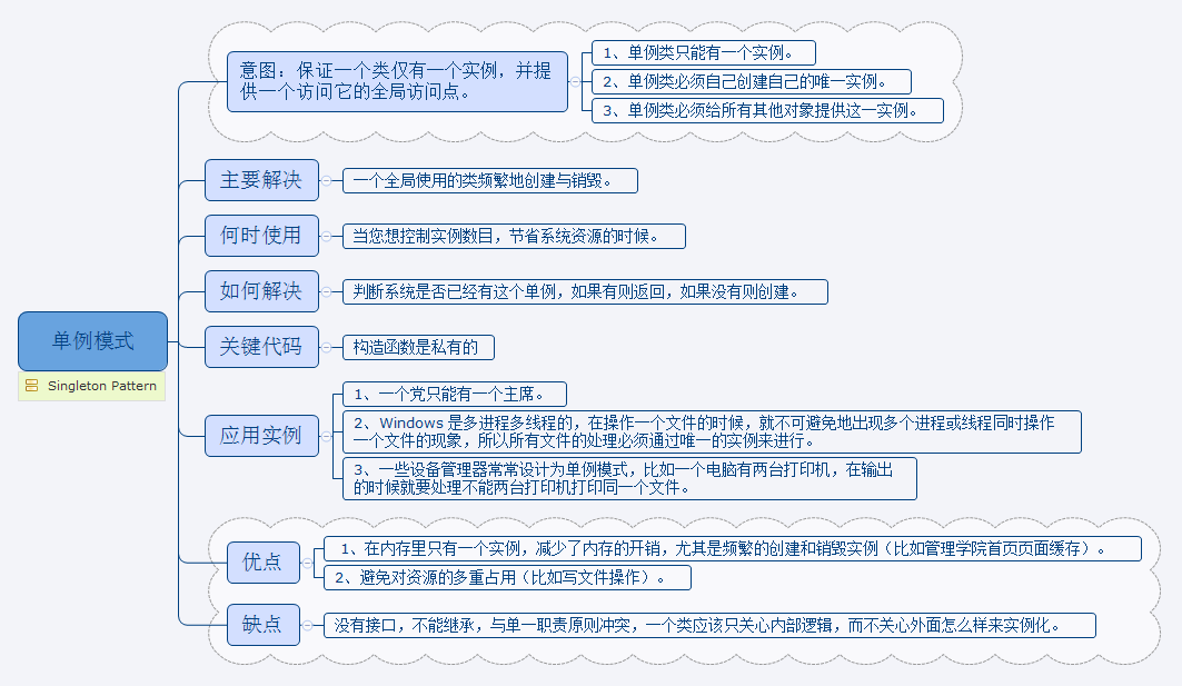 实现单例模式的思路是:一个类能返回对象一个引用(永远是同一个)和一个获得该实例的方法(必须是静态方法,通常使用getInstance这个名称);当我们调用这个方法时,如果类持有的引用不为空返回这个引用,如果类保持的引用为空创建该类的实例并将实例的引用赋予该类保持的引用;同时我们还将该类的构造函数定义为私有方法,这样其他处的代码无法通过调用该类的构造函数来实例化该类的对象,只有通过该类提供的静态方法来得到该类的实例。