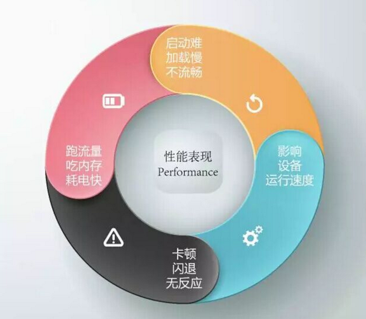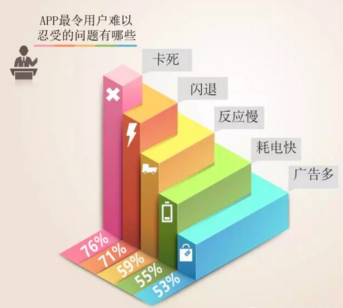 互联网app的性能是决定app生涯的首要点。测试角度去看,app启动难,加载慢,不流畅,耗流量,占内存,耗电快,影响设备运行速度,卡顿,闪退,无反应,这些都是用户很难接受的,这样的用户体验可想而知。