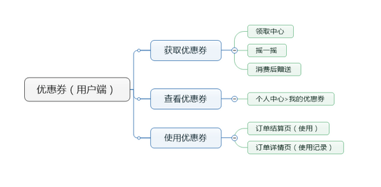 所以,重要功能的流程图,可以说是一份PRD的灵魂,是千万不可以省略的(为了避免全是文字,产生视觉疲劳,以用户端的优惠券功能为例,特附优惠券总体结构图和优惠券功能下的一个流程图)。